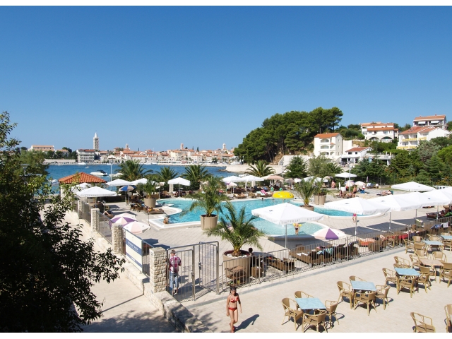 Hotel je smješten direktno na moru, uz plažu, s pogledom na stari grad Rab. Lijepe šetnice se nalaze u neposrednoj blizini hotela.